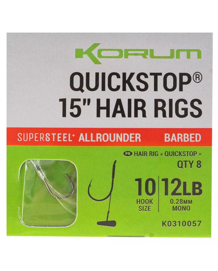 Korum Big Fish 15 Quickstop Hair Rigs, Designed to provide stronger hair rigs when fishing for bigger fish. Increased line diameters and more powerful japanese hooks provide the perfect big fish Quickstop Hair Rig.