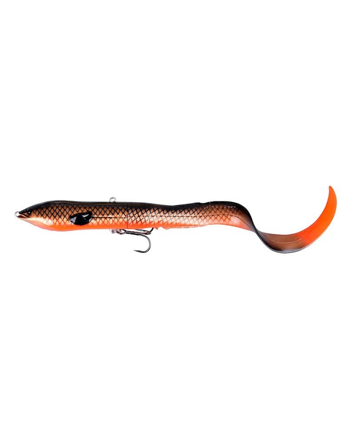 A super versatile Real Eel imitation loaded with innovative features! The design is simple yet very clever and will ensure you superb results on any predator that will go for an eel or lamprey! The 3D Scanned details will fool even the most vary predator fish and ensure you brutal attacks. The long tail, will make the lure rock enticing from side to side and leaving a great eely snaky tail after it. When the tail is screwed on tail down the up force on the tail part will push the head of the lure down so it runs under the surface in more or less the same depth all the way in Turn the tail Up, and down force on the tail will force the head up so the eel comes to the surface and runs right under the surface creating a create super wake effect! The short tail turns the hard lure into a superb glider with a great side to side glide with slight tabs from the rod tip. The downturned tail will create up force on the tail part so the lures stays down in 2-4 feet all the way in turn the tail up and the down force on the tail will force the lure to the surface straight way with a super wide and breaking glide. The big size, comes with and innovative double magnets system to hold the front belly hook in position and enhance presentation and hook up rate. Both sizes have a back 8pin to enable back hook position to be able to mud drag the lure or fish it over grass or submerged weed even on super shallow water. We offer spare tails and custom provocation tails to complete the perfect Hard lure tail bait range!
